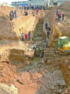 26日,考古人员继续对北齐墓外围进行一番清理。由于墓底距地面7-8米,加之周边土质较疏松,不断出现淤土滑落的情形,清理外围可有效地保护现场施工的考古人员人身安全。目前该北齐墓内已经溢满渗水,下一步需要排水。