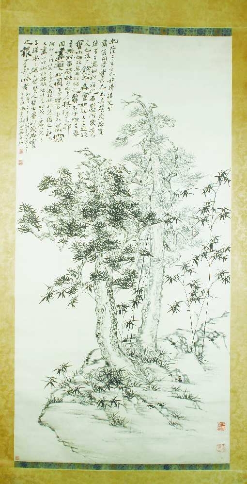 这幅《双松图轴》是郑燮中进士第一年的作品,也是他鼎盛时期的绘画作品之一。画中双松擎天而立,旁立三枝细竹。竹子画得艰瘦挺拔,直冲云天,墨色水灵,浓淡有致,逼真地表现出竹的质感。在构图上,郑燮将竹、石的位置关系和题诗处理得十分协调。竹的纤细清飒更衬托了松的另一番风情。郑燮擅兰竹,画兰竹五十余年,自成家法,用笔独到,多而不乱,少而不疏,遒劲潇洒,风格劲峭。竹是板桥理想的幻影,最能表现其思想。郑燮本是个聪明绝顶、通今博古的一代文豪,却写出了“吃亏是福”、“难得糊涂”的名句,这注定他不会左右逢源,不能容于官场。郑燮将文同的“胸有成竹,意在笔先”提高到“胸无成竹,趣在法外”,他苦苦探索,一生心血洒在画竹上,在画史上占有着重要的地位。