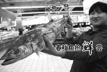 3月27日,在辽阳路一家大型超市,工作人员展示刚刚上市的新鲜春鲅鱼。据了解,超市此次采购的春鲅鱼并非本地渔船捕捞,数量不多,由于是第一拨春鲅鱼,虽然每斤价格高达16.8元,但仍吸引了不少市民的眼球。本报记者 张晓鹏 摄影报道