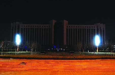 26日晚8时,日照市政府大楼内一些房间仍亮着灯。但是到了晚8时30分,所有房间内的灯全部熄灭了,紧邻的会展中心也变得漆黑一片。
