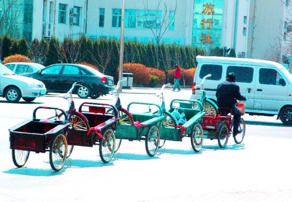 27日上午11时许,记者在府前大街与胶州路交会处看到,一名市民的三轮人力车后面挂着四辆崭新的三轮车摆成了长长的一排,行驶在大街上,宛如一列微型火车。由于“车体”太长,该市民拐弯时很费劲,让人不得不担心行车的安全。 本报见习记者 段学虎 摄影报道