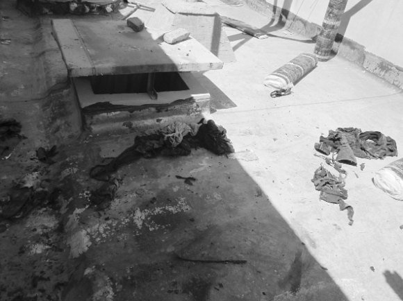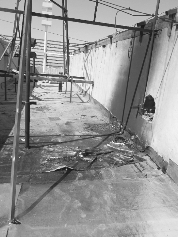 在这位工人指引下,记者通过天窗的竖梯爬上楼顶,看到三四捆防水油布立在那里,油布旁边散落着一件被烧坏的蓝色上衣,上面印有“祥泰防水”字样,旁边一顶红色帽子也被烧出三四个洞。在楼顶西面,一面墙被烧黑,附近也散落着两件烧焦的衣服,楼顶中间立着一桶汽油。