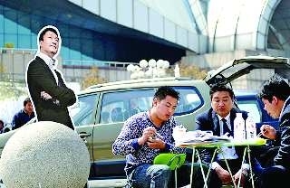 自述:车展销售人员在吃午饭,某款车的代言人“孙红雷”在一旁看着。