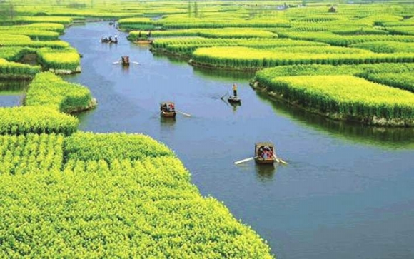 泰州是著名的水乡,历来人文荟萃,商贾云集,市场繁荣,文化昌盛,素有“汉唐古郡,淮海名区”之称。在泰州兴化,当地农民在水中取土堆田,整齐如垛,并在上面种植农作物,演变到今天就成了独特的垛田油菜花海。每年清明前后,千姿百态的垛田形成了上千个湖中小岛,岛上开满金灿灿的油菜花,在水面上形成一大片金黄色“花海”,土生土长的船家划着农家小木船,带你徜徉于花海之中,体验“船在水中行,人在花中走”的别样风情。每年当地都要举行声势浩大,精彩纷呈的“千岛菜花节”,吸引数十万人前来逛水乡,赏花海。今年,他们邀请杨澜、成龙、谭晶等大批演艺明星,举办大型水上实景演出。