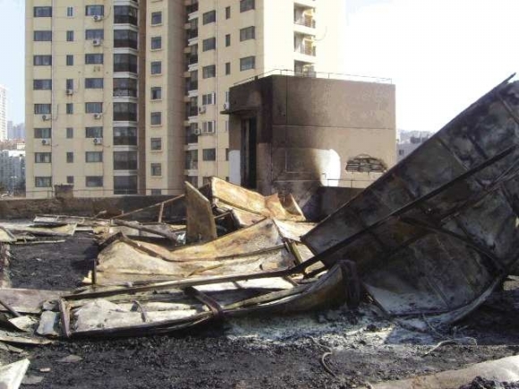 中午1时许,记者接到读者热线,称位于台东的老面包厂起火。随后,记者赶往位于台东桑梓路与东光路路口的这处旧厂房,发现工人们正在对厂房进行改造,火已被扑灭。记者爬上位于厂房3楼楼顶,一股刺鼻的气味迎面而来,楼顶上一片狼藉,到处是防水材料燃烧后的灰烬,放在楼顶的铁皮雨棚和周边的墙壁全被熏黑,旁边还放着三只灭火器和一只被熏黑的煤气罐。