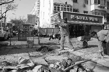 随着天气渐暖,威海威畅市政工程维护中心开始在市区范围内,对冬季受损路面进行大规模维修。图为29日下午,工人在统一路上对损毁的人行道进行修补。