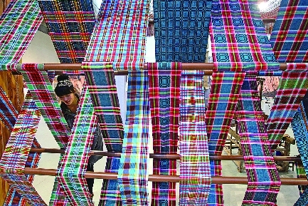 28日,山东工艺美术学院内,—名学生正在观看鄄城的民间土布手艺。当日,该校将农村手工艺术品搬进高校,让学生们在传统中吸取“营养”,创新未来。 本报记者 左庆 摄