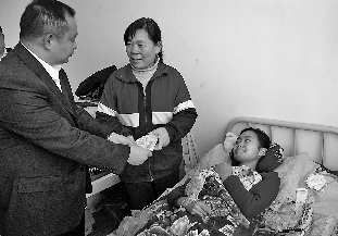 跟随记者前去病房的还有济宁海川塑钢制品有限公司的王福亮总经理,他是听说此事后,专门赶到医院看望梁亚平,并当场捐出了5000块钱。看到有好心人帮助自己,亚平流泪了。