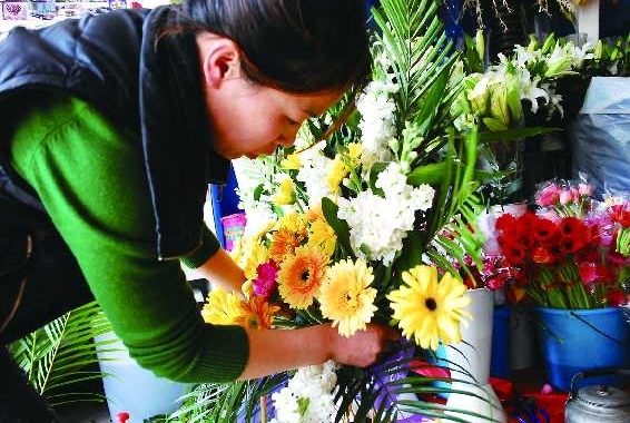 30日,在东城胶州路一家鲜花店内,店主正在制作素色鲜花。据介绍,清明节前的这几天,每天到花店订鲜花的人特别多,所订鲜花以白色和浅黄色的菊花、百合为主。 本报见习记者 任小杰 摄影报道