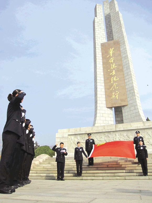清明节前夕,泰安市公安局巡特警支队三大队一中队民警来到泰安市烈士陵园缅怀烈士,接受革命传统教育。