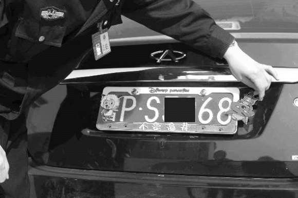 29日,茌平交警查处这么一辆遮挡号牌车。牌架上的卡通喜羊羊和灰太狼不但遮挡号牌,还可以360度旋转。交警依法对驾驶员罚款200元,扣6分。