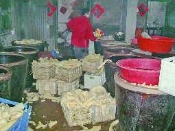 近日,济南市质监局市中分局接到群众举报,市中区白马山办事处南红庙村有一处利用非食品原料生产食品的黑窝点。4月1日上午,执法人员立即赶到现场进行查处。执法人员检查发现,这是一处利用工业用盐酸、双氧水、明矾和工业用盐生产加工肉皮和海带的黑窝点。
