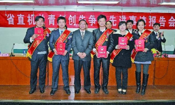 4月1日,本报日本大地震特派报道团队中的5名记者乔显佳(左一)、董钊(左二)、鲁超国(左四)、刘红杰(左五)、刘爽(左六)荣获“2011年度山东省省直机关杰出青年岗位能手”称号并记三等功。因年龄原因未能获奖的报道团成员左庆(左三)受邀上台一起分享荣誉。 本报记者 周青先 摄A06?重点