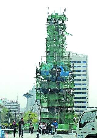 1日,济南风很大,泉城广场正在进行的泉标清洗、油漆施工在风力加大时暂停,以保证安全。 本报记者 周青先 摄