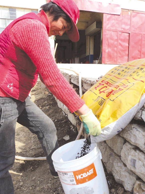 23日下午,记者来到肥城市桃园镇北台村阴法坤的桃园,工人们正在桃园里施农家肥。当工人从肥料袋子里倒出来一些小球状的黑色肥料时,记者闻到一股怪味,原来这是鸡粪做成的肥料。