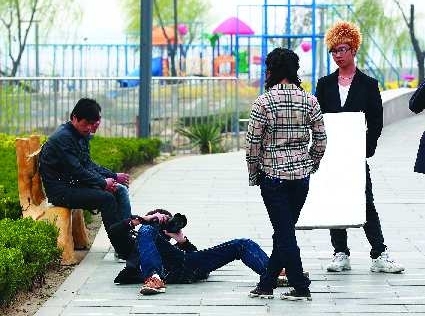 事件:在临沂滨河景区沂河东岸,一位摄影师躺在地上为他人拍照,其敬业精神令人敬佩。