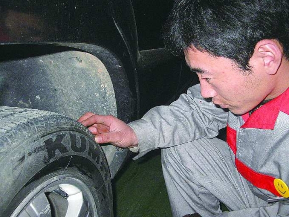 国家质检总局2日通报,锦湖轮胎承认部分产品在生产过程中过量使用返炼胶,并承诺从4月15日起召回7个批次编号的锦湖轮胎。这离锦湖轮胎被央视“3·15”晚会曝光已过去了半个多月。图为在省城一家汽车贸易公司维修车间内,工作人员对锦湖轮胎进行检查。 本报记者 王倩 摄