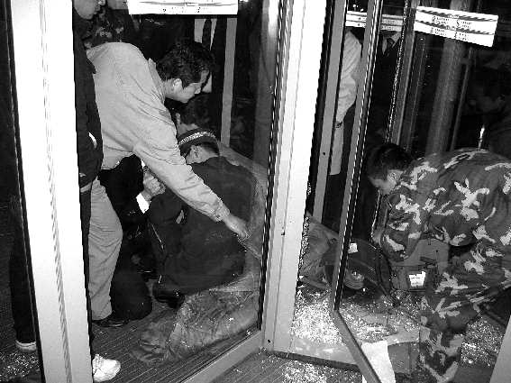 下午6时许,记者赶到位于青岛香港中路上的颐和国际商务楼时,门口已经停了两辆消防车和一辆救护车,旋转门的右侧钢化玻璃被砸碎,地上散落着玻璃碎片。商务楼内的工作人员已经用被子盖住伤者,被子下面不断传来孩子的哭声,商务楼的工作人员正用铁锹从底部将旋转门尽量往上托起。尽管用铁锹往上托,但是孩子的脚并不能抽出。门口围观的人越来越多,身穿制服的商务楼内工作人员开始阻挠记者拍照和采访。
