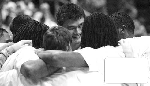 北京时间4日,休斯敦火箭队在落后14分的劣势下,主场以114:109逆转战胜亚特兰大老鹰队,实现主场七连胜,可惜闯入季后赛的希望越来越渺茫。图为因伤缺阵的姚明在赛场向队友们送出祝福。