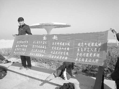 台市风筝协会环海俱乐部的秘书长刘云祥,他向记者展示了一张条幅,上面印着他写的一首题为《鸢