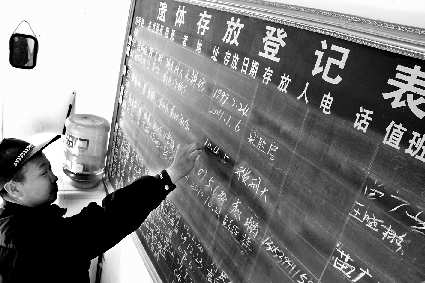 在黑板上登记的信息中,最早的一具遗体是1999年送到殡仪馆的,由于没有公安部门的相关文件,也没有家属来认领,只能长期躺在冷库里。黑板上还有很多遗体的姓名处填写的是“无名”,即使有名,也有很多是常年没有家属来认领。