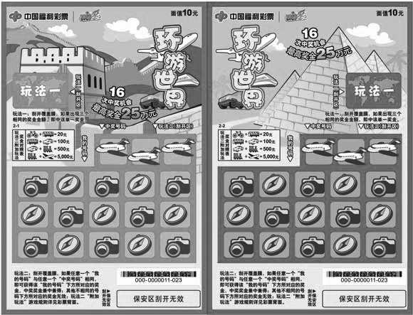 “环游世界”彩票面值10元,奖级11级,头奖25万元,共有16次中奖机会,中奖面为33.01%。游戏规则:本彩票共有两个玩法,两个玩法区内的中奖奖金兼中兼得。