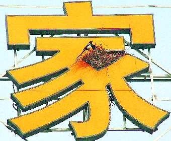 自述:一对喜鹊将窝建在家居商城的“家”字上。
