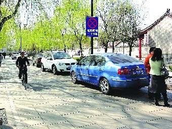 3月27日,在曲水亭街道路两边,虽然立有禁止停车的标牌,但不少车辆依然停车。(请作者与本报联系)