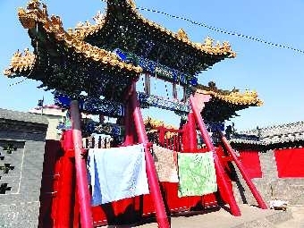 3月27日,在济南府学文庙东门,被子晒在门口显得极不协调。(请作者与本报联系)