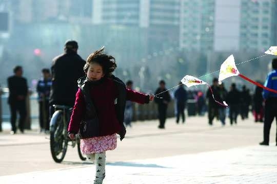 5日,在五四广场,一名儿童正在高兴地放风筝。当日正值清明节,阳光明媚,气温上升至10℃以上,人们纷纷来到广场上游玩,到公园踏青,享受春天的温暖。