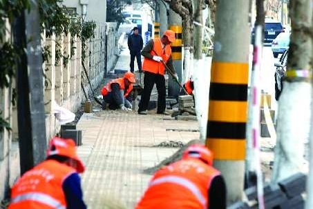 5日,在澳门路上,工人正在铺新的路面,并增铺了盲道。据介绍,此路段因时间过长路面已经破损,新铺的路面将以彩色路砖为主,并增铺了盲道。 本报记者 杨宁 摄