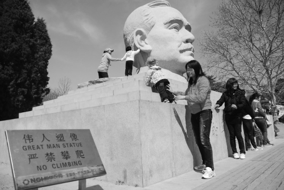由于公园里开放的鲜花很少,不少游客围着仅有的几株梅花不停地拍照,有的游客将孩子抱到树杈上,有的干脆折了枝花拿在手里把玩。在这些盛开的花树下,花瓣也被人为地摇落了一地。