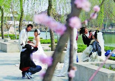 4月5日,在德州太阳谷,一些计划五六月份结婚的新人抓住大好春色赶拍婚纱照。据了解,假期拍摄人数较平时明显增多。