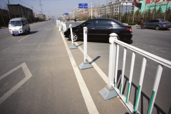 5日,在潍坊市玉清街新华路附近,一辆车从损坏的护栏中间穿过。道路中间的护栏损坏,留下了几段空缺,有的车辆贪图方便,就从护栏的缺口横穿马路,让人捏了一把冷汗。