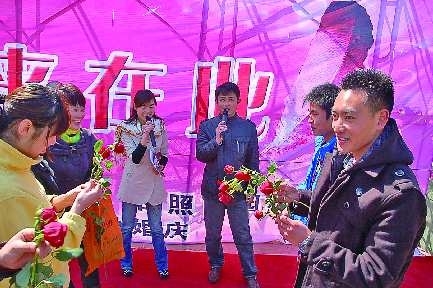 图为4月3日,海曲公园相亲活动现场赠送玫瑰游戏环节,参与者手持玫瑰
