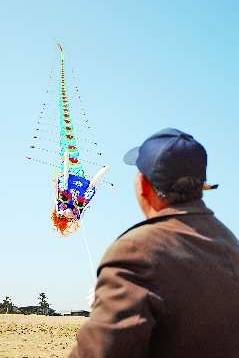 在万平口广场海滩上,一市民正在放飞百米长的龙形风筝。 本报见习记者 张照朋 摄