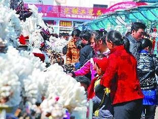 ▲万平口广场纪念品商业街内人头攒动,游客们正在挑选纪念品。