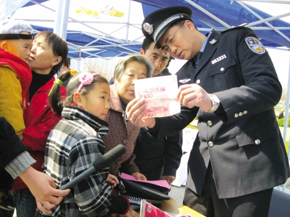 4月1日,泰山区公安分局警营开放日暨警务装备配发仪式在泰山广场举行。图为民警在为市民讲解怎样辨别纸币真伪。