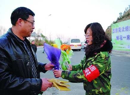 4月5日清晨,在古陌岭公园进山路口处,市民孙先生将准备携带上山扫墓的烧纸递给鲸园街道工作人员,换回了两束鲜花来代替祭奠用品。2011年已是鲸园街道第三年开展鲜花换纸钱活动,今年选择文明祭祀的市民明显增多。