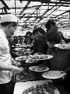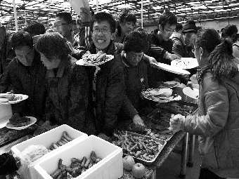 12时许,包括游客在内的900多人走进会棚,免费品尝具有胶东风味的渔家饭菜。两排长达30米的不锈钢盆或柳编筐中,舌头鱼、小黄花、黄瓜条、花卷、油旋、紫菜汤、鸡蛋汤、啤酒、烧酒……近20种海鲜、农家菜,由大家顺次领取。喝着啤酒,来自重庆、青岛等地的游客连呼“荣成人真热情”。