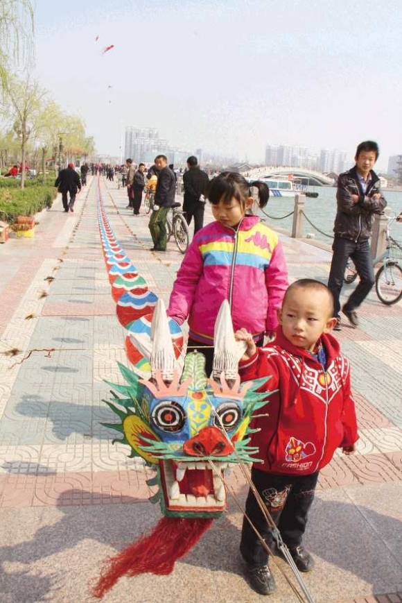 “哇,这么长的风筝能飞起来吗?”翟清明和邵海英一打开他们做的“龙头蜈蚣”风筝,很多市民放下自己手中的风筝跑过去看。