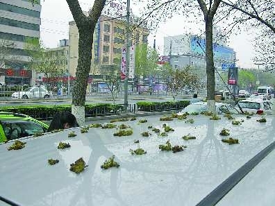 6日,记者在泺源大街看到,从路边白蜡树上落下的“毛毛虫”落在车顶,让很多车主烦心,因为这些物质中含有树胶,落在车顶很难洗掉。济南一家洗车点工作人员表示,树胶粘在车上时间较长时,需要对汽车进行抛光处理。本报记者 王倩 摄影报道