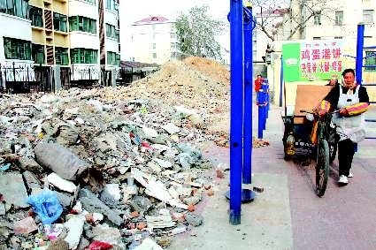 6日,鸢飞路附近一居民区内,一堆数十米长的建筑垃圾堆放在小区公共道路上。据了解,这些建筑垃圾堆放在此已有一周左右的时间了,遇上大风天气,尘土飞扬,给附近居民带来不少困扰。