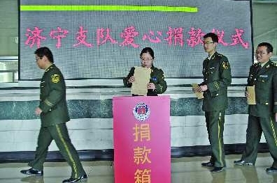 6日上午,济宁市消防支队举行了一场捐款仪式,为高新区消防中队战士梁开仲患脑膜炎的1岁儿子梁志翔献爱心。捐款活动开展一周就募集善款85855元,目前活动仍在继续进行。 陈鸿儒 李峰 井源 摄影报道