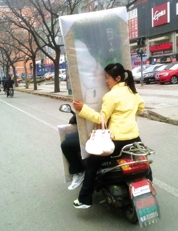 4月6日,在东岳大街上,一市民坐在摩托车尾,手里扶着高约1.5米的相框,晃晃悠悠,真让过往的行人为她们的安全捏了一把汗。