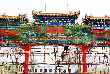 从去年开始建设的古运河风景区运河文化广场初现雏形。4月6日,工作人员正在对在建的德州运河文化广场上的牌楼涂刷油漆,为其穿上新装。