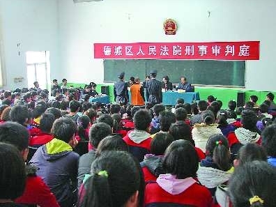 4月1日上午9点30分,随着审判长敲响法槌,一起持枪入室抢劫案件在德城区电大南校区正式公开审判,该校全体师生旁听了庭审。