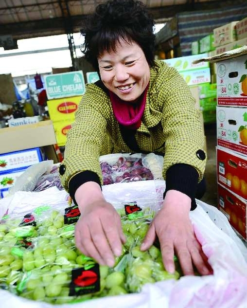4月6日,枣庄市果品批发市场内摊主崔女士正忙着整理刚从美国进口的优质青提。据介绍,近期随着季节更替,苹果、梨、柑橘等大众水果出现了暂时滞销,与此相反的是,市场上洋水果的销量却比往年有所增加。