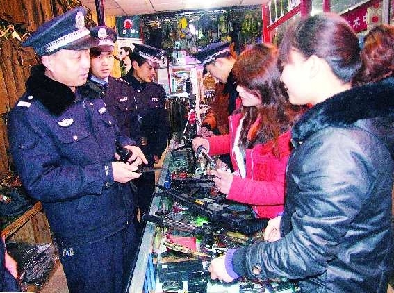 记者近日跟随滕州市公安局荆河派出所民警,参与了对辖区内非法销售仿真枪械的店面开展的拉网式清查行动。此次行动中,民警共清查销售摊点26家,当场查缴各类仿真抢59支,管制刀具16把,另有警用强光手电、警用伸缩棍等物品一宗,现场抓获正在进行非法销售仿真枪械的违法人员2名。