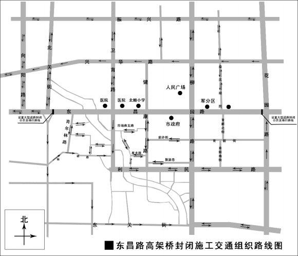 过往车辆绕行路线:自东向西车辆右转绕行花园路至兴华路、振兴路;自西向东车辆右转绕行北关街至镜明路或北城墙路至东关桥、闸口、陈口路;柳园路或卫育路南北通过东昌路限高3.5米。